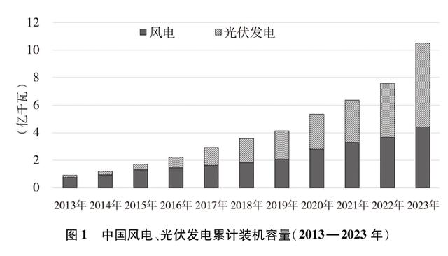 推动风电、光伏发电跃升发展。中国风能、太阳能资源丰富,风电、光伏发电成为清洁能源的主力军。有序推进大型风电光伏基地建设,以库布其、乌兰布和、腾格里、巴丹吉林沙漠为重点,规划建设4.5亿千瓦大型风电光伏基地项目。推进海上风电规模化集群化发展,累计装机规模达3728万千瓦。积极推进分布式新能源发展,开展“千乡万村驭风行动”“千家万户沐光行动”,推广农光互补、渔光互补、牧光互补等“光伏+农业”新模式,打开了农村新能源发展的广阔空间。截至2023年底,中国风电、光伏发电累计装机容量分别达4.41亿千瓦、6.09亿千瓦,合计较10年前增长了10倍。其中,分布式光伏发电累计装机容量超过2.5亿千瓦,占光伏发电总装机容量40%以上。