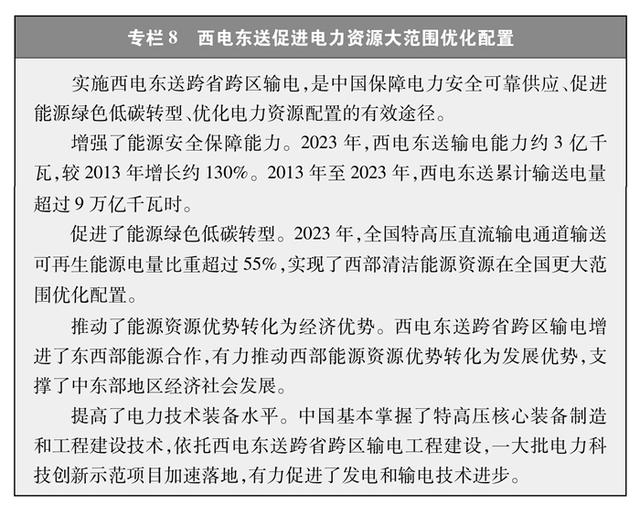 加强能源管网互联互通。为加强资源优化配置,中国加快建设横跨东西、纵贯南北、覆盖全国的能源网络基础设施,提升能源大范围远距离输送能力。形成“西电东送”北、中、南三大通道的跨省跨区输电格局,输电能力约3亿千瓦,建成20条特高压直流输电通道。不断完善区域电网主网架,形成以若干区域电网为主体、区域间有效互联的电网格局。基本形成油气“全国一张网”,油气资源优化配置和互济互保水平显著提升。截至2023年底,全国长输油气管网总里程约19万公里,其中原油管道3.3万公里、成品油管道3.3万公里、天然气管道12.4万公里。