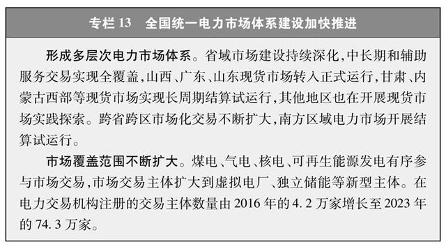 建设全国统一的能源市场。加快建设全国统一电力市场体系,省、区域、省间交易高效协同,中长期、现货、辅助服务交易有机衔接。组建电力交易中心、石油天然气交易中心和煤炭交易中心,搭建公开透明、功能完善的能源交易平台。全国市场化交易电量占全社会用电量比重由2016年的17%提高到2023年的61.4%,2023年风电光伏市场化交易电量占风电光伏总发电量的47%,有力促进了电力资源的优化配置和可再生能源的高效利用。