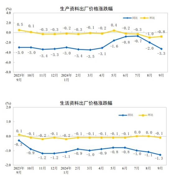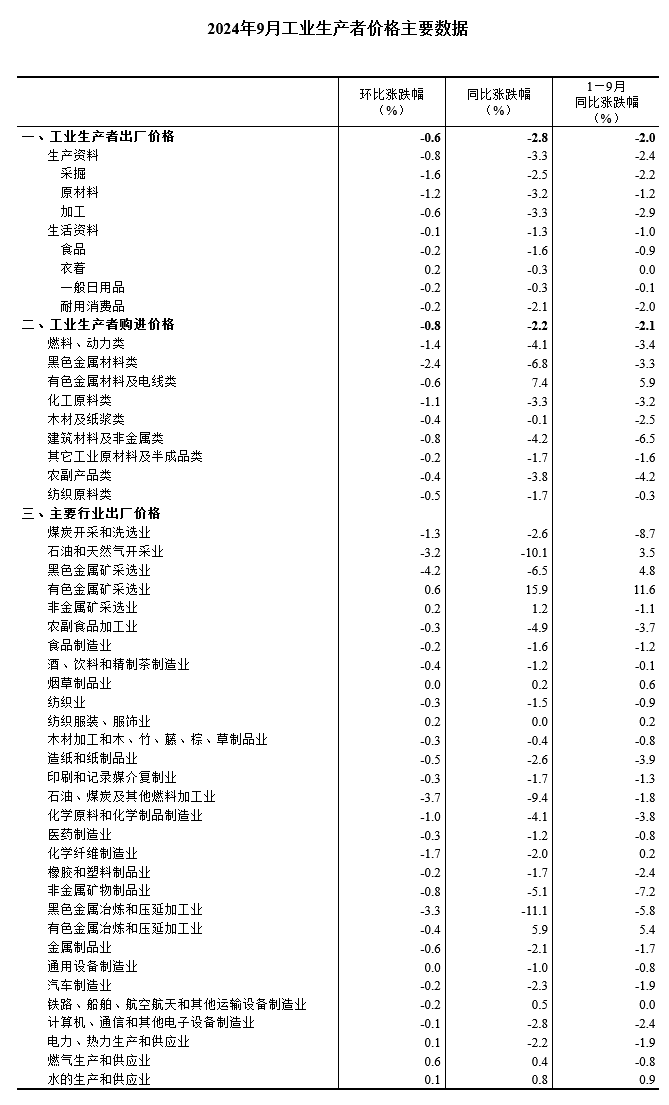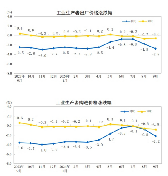 2024年9月份,全国工业生产者出厂价格同比下降2.8%,环比下降0.6%;工业生产者购进价格同比下降2.2%,环比下降0.8%。1—9月平均,工业生产者出厂价格比上年同期下降2.0%,工业生产者购进价格下降2.1%。