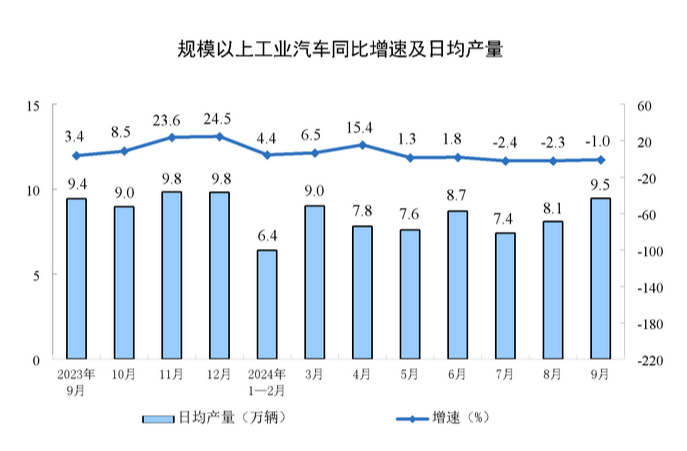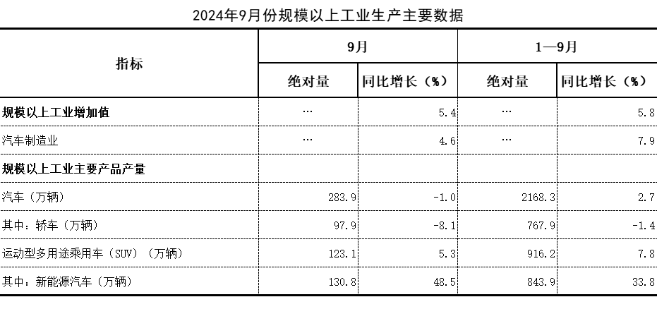 9月份,规模以上工业619种产品中有345种产品产量同比增长。其中, 汽车产量283.9万辆,同比下降1.0%,其中新能源汽车产量130.8万辆,同比增长48.5%。