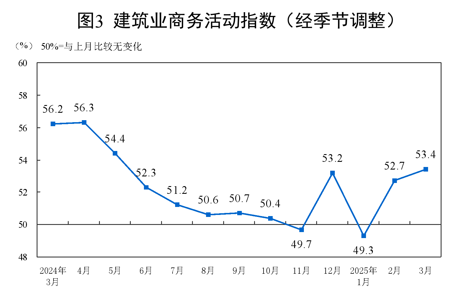 (二)建筑业施工进度加快。受气候转暖,各地建设项目加快推进等因素影响,建筑业商务活动指数继续回升,为53.4%,比上月上升0.7个百分点。从市场预期看,业务活动预期指数为55.3%,升至较高景气区间,建筑业企业对近期市场发展信心有所增强。
