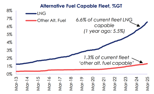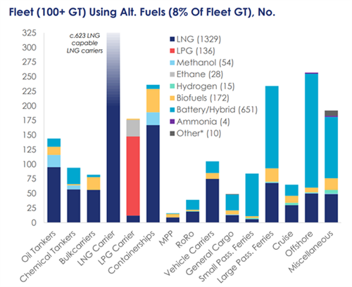 根据克拉克森的数据,整体而言按吨位计算,截至目前在运营船队中能够使用替代燃料或推进装置船舶的比例已经提高到了7.8%,高于2017年的2.6%和2024年年初的6.4%。在现有总计2261艘替代燃料船舶中,包括1329艘LNG动力船、54艘甲醇动力船、136艘LPG动力船、651艘电池/混合动力推进船,此外还有230艘采用其他燃料。
