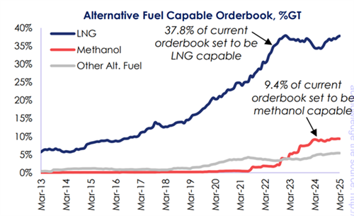 而在手持订单中,替代燃料船舶占比更是达到了52.6%,高于2017年的10.9%和2024年初的48.5%。按吨位计算,手持订单中37.8%为LNG动力船(1037艘),9.4%为甲醇动力船(304艘),2.0%为LPG动力船(132艘);此外还有约3.4%(约531艘)使用其他替代燃料,其中包括33艘氢燃料、67艘乙烷燃料、43艘氨燃料、16艘生物燃料和485艘电池/混合动力推进船舶,替代燃料船舶手持订单总计2004艘。