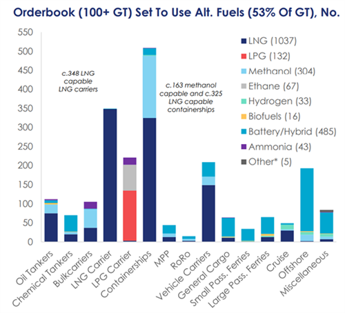 今年的替代燃料船舶订单包括LNG动力船38艘450万总吨,甲醇动力船7艘40万总吨,以及电池/混合动力推进船舶27艘20万总吨。