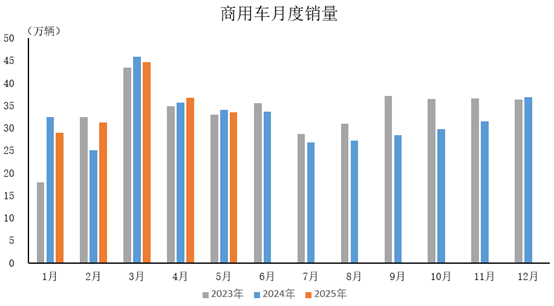 2025年5月,商用车产销分别完成33.6万辆和33.5万辆,环比分别下降7.4%和8.8%,产量同比增长4.4%,销量同比下降2%。