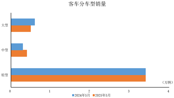 2025年1-5月,客车产销均完成21.2万辆,同比分别增长5.4%和5.7%。在客车细分品种中,与上年同期相比,轻型客车产销小幅增长,中型客车产量小幅增长、销量微降,大型客车产销小幅下降。