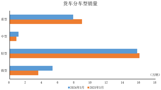 2025年1-5月,货车产销分别完成153.4万辆和154万辆,同比分别增长4%和0.6%。在货车细分品种中,与上年同期相比,重型货车和轻型货车产销呈不同程度增长,中型货车和微型货车产销呈不同程度下降。