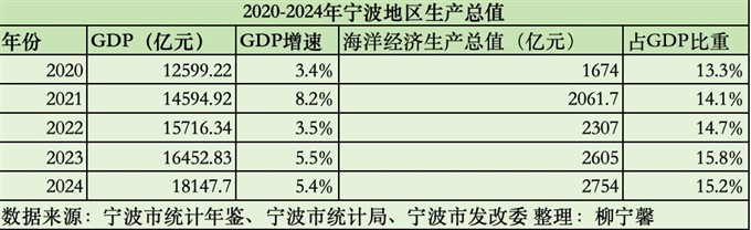 2021年,宁波全市海洋生产总值首次超过2000亿元,随后逐年增长,2024年这项数值为2754亿元,占宁波GDP比重达15.2%。