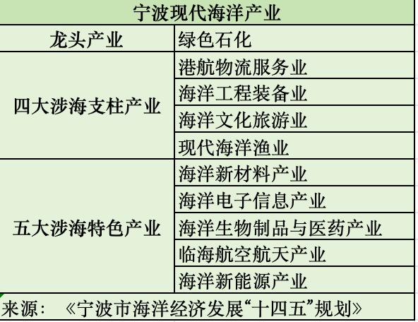 《宁波市海洋经济发展“十四五”规划》 对宁波现代海洋产业有了大致的规划,包括龙头产业绿色石化,港航物流服务业等四大涉海支柱产业,海洋新材料产业等五大涉海特色产业。