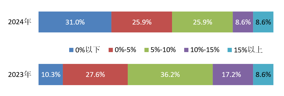 利润率分布情况见图2。与上年相比,利润率在0%以下企业数占比上升20.7个百分点;0%-10%占比下降12.1个百分点;10%-15%占比上升1.7个百分点;15%以上占比下降10.3个百分点。