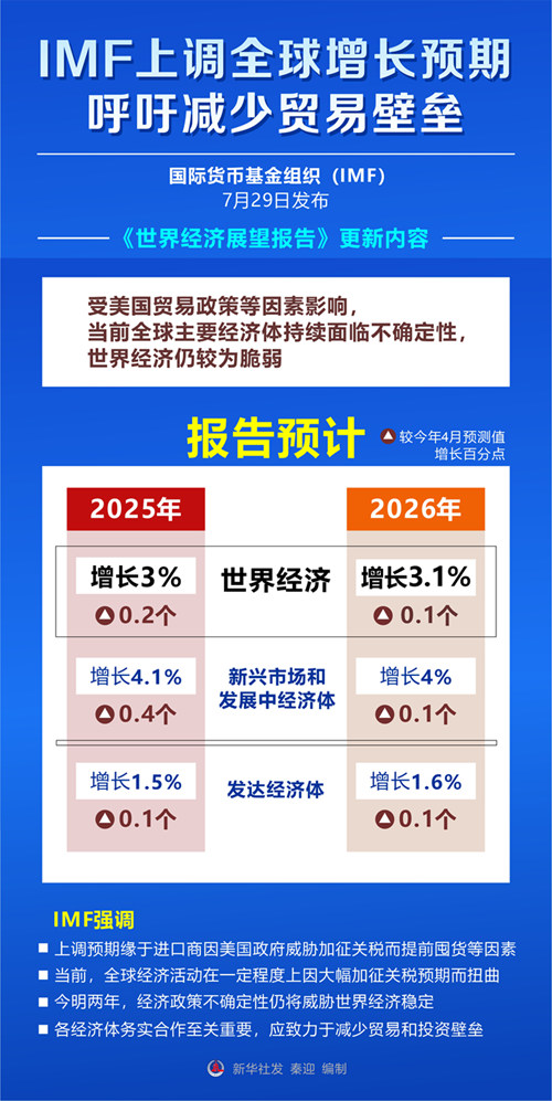 国际货币基金组织(IMF)29日发布《世界经济展望报告》更新内容,小幅上调今明两年世界经济增长预期。IMF指出,受美国贸易政策等因素影响,当前全球主要经济体持续面临不确定性,世界经济仍较为脆弱。
