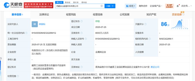 近日,天眼查App显示,西藏金山耐磨材料有限公司成立,法定代表人为林国标,注册资本8000万人民币,经营范围含金属制品研发、黑色金属铸造、金属表面处理及热处理加工、锻件及粉末冶金制品制造、钢压延加工、铸造用造型材料销售、金属制品销售等。股权全景穿透图显示,该公司由福建金山耐磨材料有限公司全资持股,后者为紫金矿业集团南方投资有限公司全资子公司。