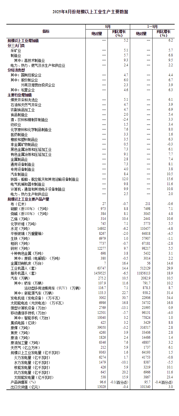 分三大门类看,8月份,采矿业增加值同比增长5.1%,制造业增长5.7%,电力、热力、燃气及水生产和供应业增长2.4%。