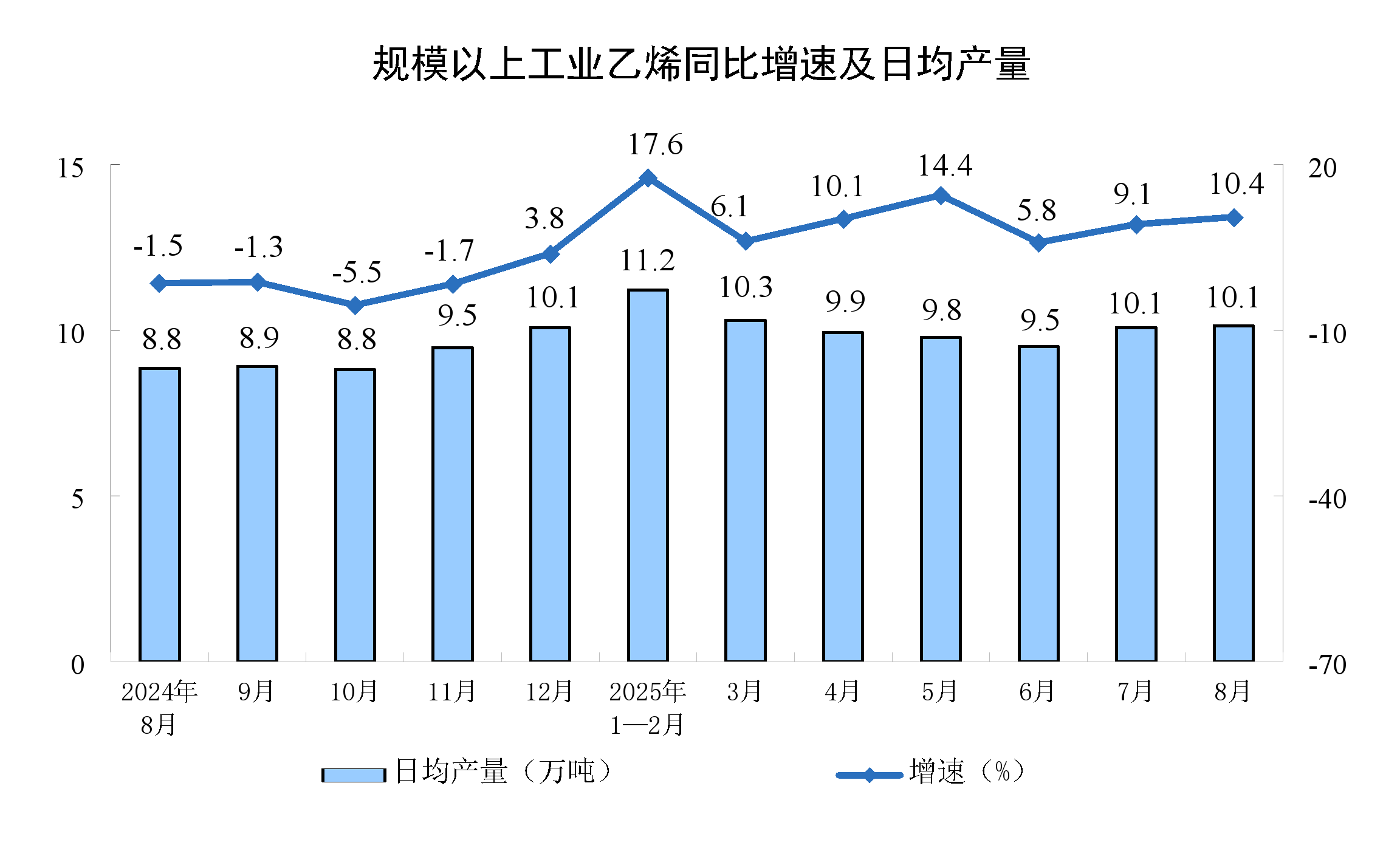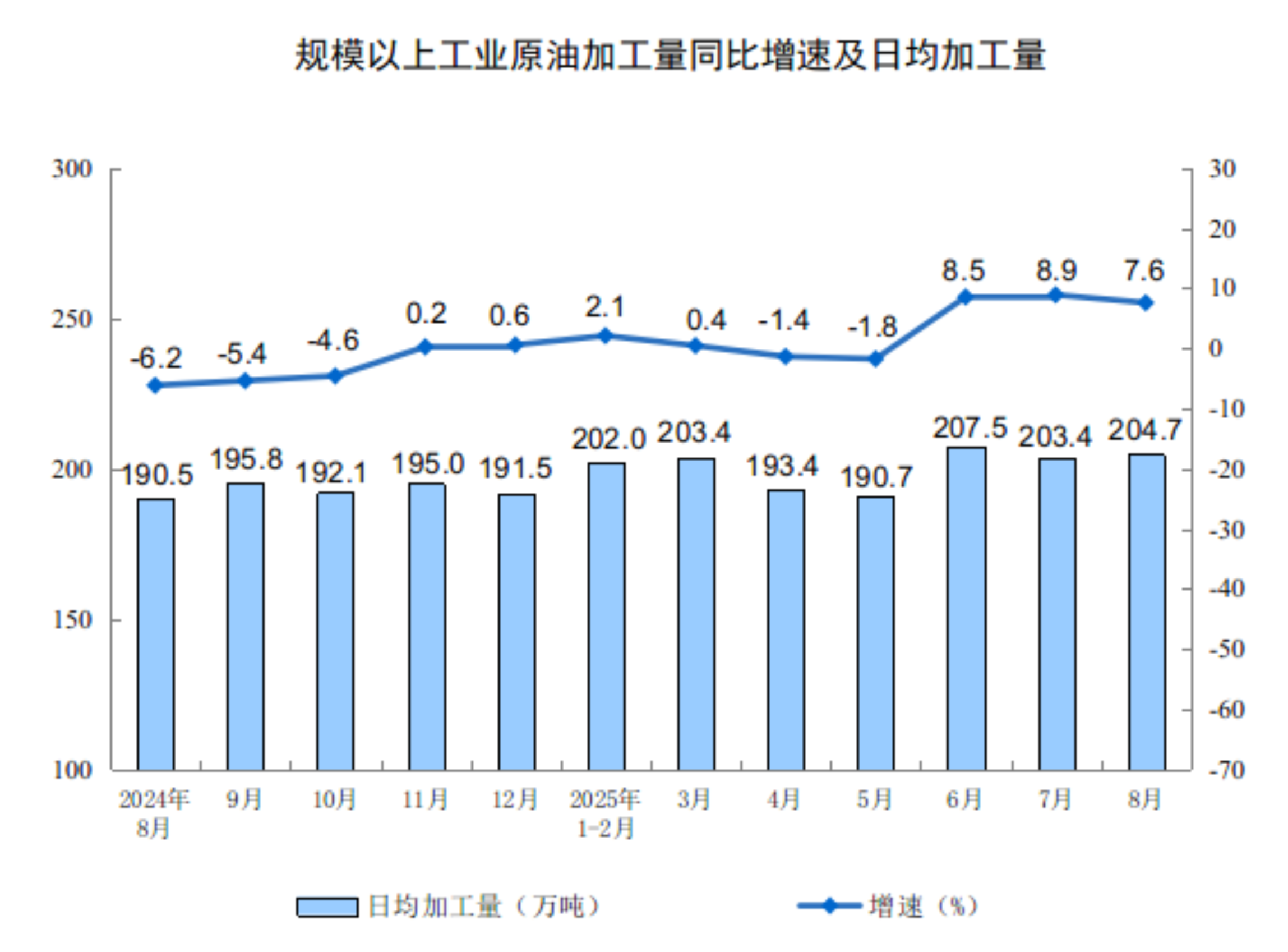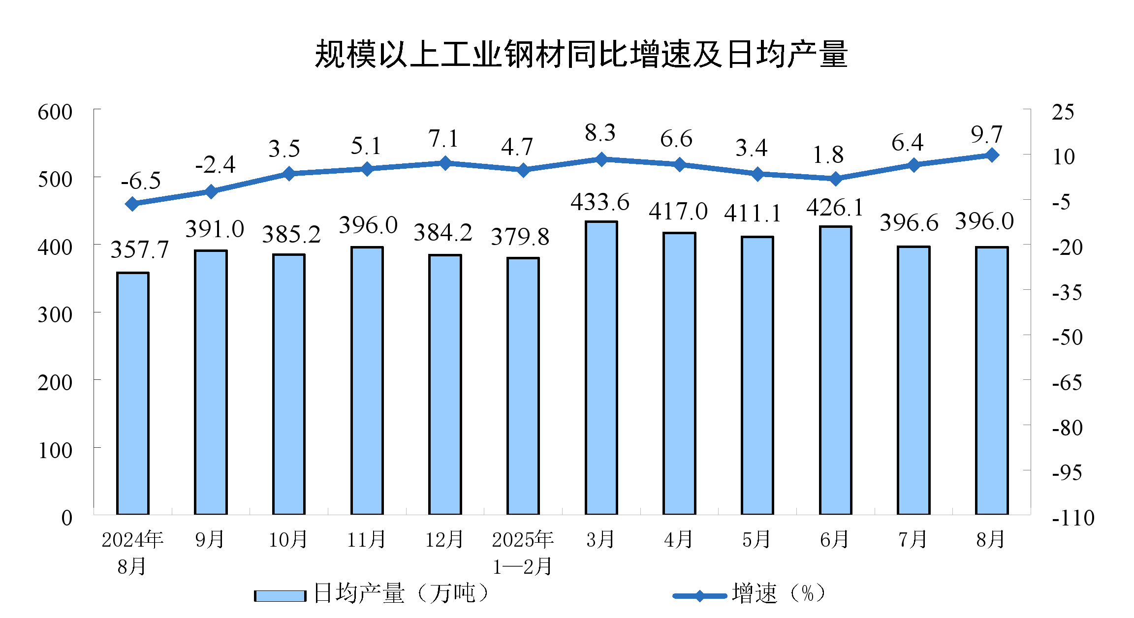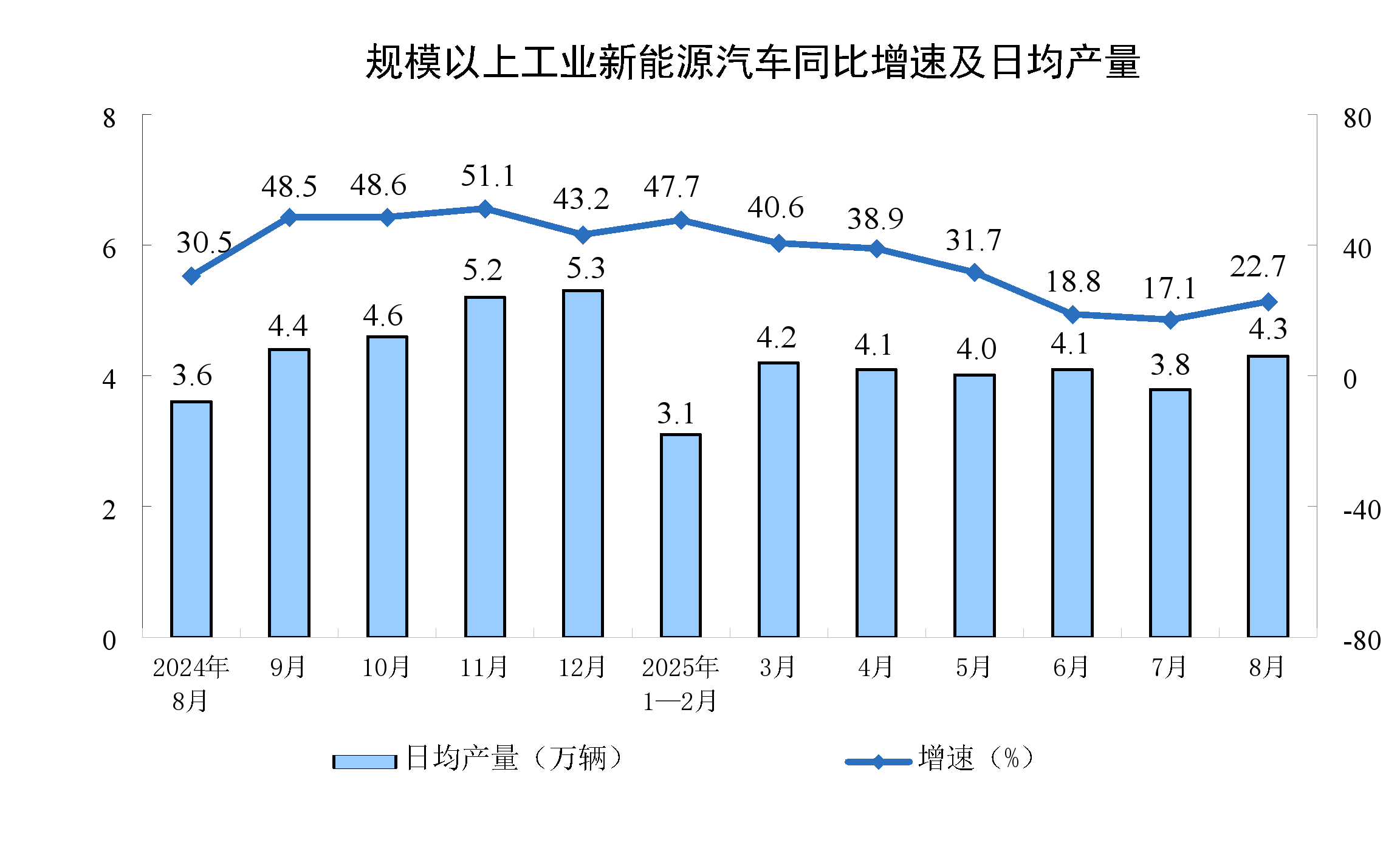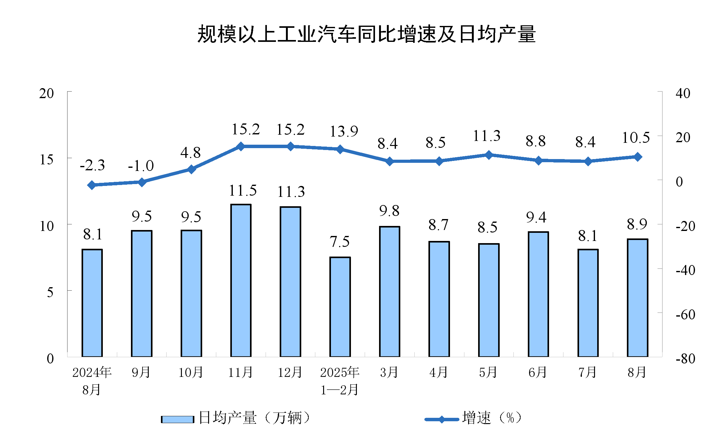 分产品看,8月份,规模以上工业623种产品中有319种产品产量同比增长。其中,钢材12277万吨,同比增长9.7%;水泥14802万吨,下降6.2%;十种有色金属698万吨,增长3.8%;乙烯314万吨,增长10.4%;汽车275.2万辆,增长10.5%,其中新能源汽车133.3万辆,增长22.7%;发电量9363亿千瓦时,增长1.6%;原油加工量6346万吨,增长7.6%。