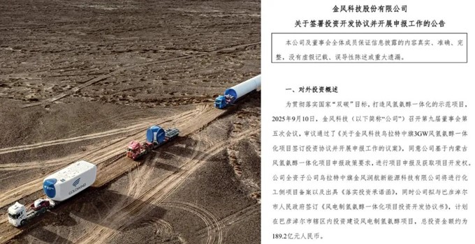 近日,金风科技抛出重磅公告,拟斥资189.2亿元,建设风电制氢氨醇项目,规划建设3GW风电装机,所发电力80%以上用于电解水制绿氢。