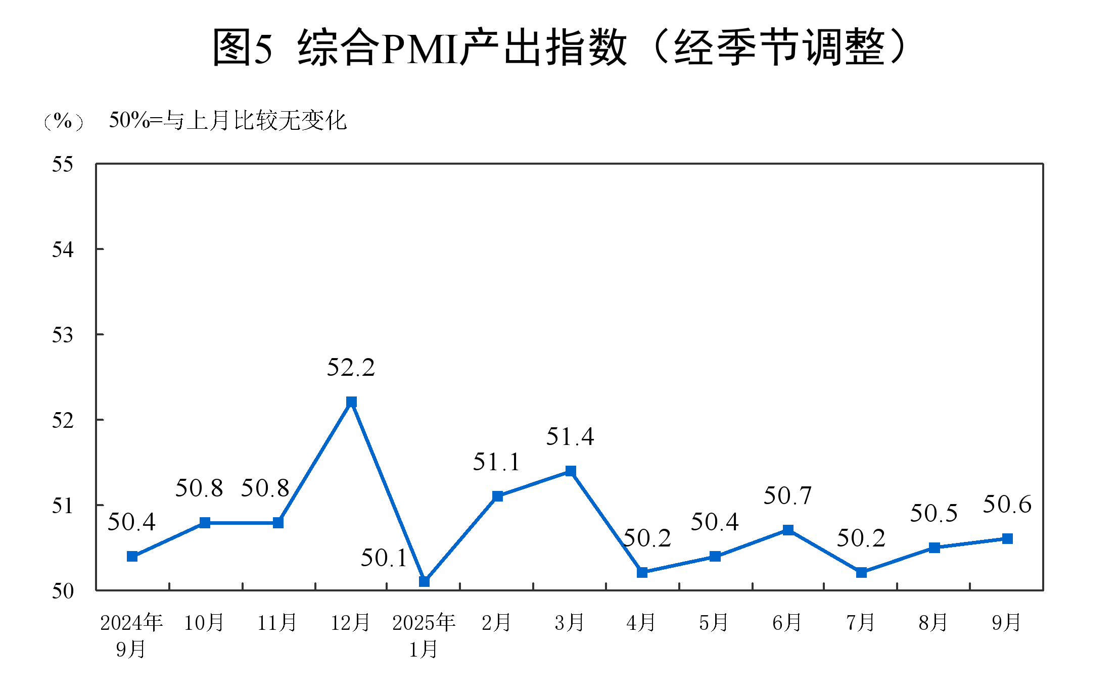 9月份,综合PMI产出指数为50.6%,比上月上升0.1个百分点,表明我国企业生产经营活动总体扩张继续加快。构成综合PMI产出指数的制造业生产指数和非制造业商务活动指数分别为51.9%和50.0%。