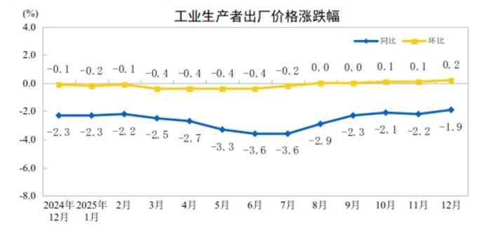 2025年12月份,全国工业生产者出厂价格同比下降1.9%,降幅比上月收窄0.3个百分点;环比上涨0.2%,涨幅比上月扩大0.1个百分点。工业生产者购进价格同比下降2.1%,降幅比上月收窄0.4个百分点;环比上涨0.4%,涨幅比上月扩大0.3个百分点。2025年全年,工业生产者出厂价格下降2.6%,工业生产者购进价格下降3.0%。