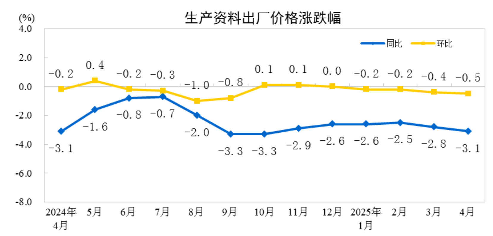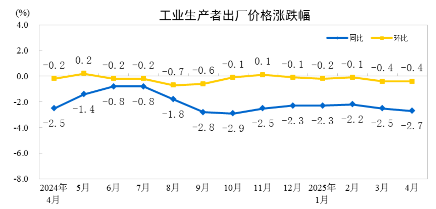 2025年4月份,全国工业生产者出厂价格同比下降2.7%,环比下降0.4%;工业生产者购进价格同比下降2.7%,环比下降0.6%。1—4月平均,工业生产者出厂价格和购进价格比上年同期均下降2.4%。
