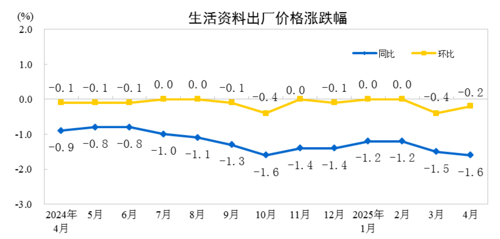 4月份,工业生产者出厂价格中,生产资料价格下降3.1%,影响工业生产者出厂价格总水平下降约2.28个百分点。其中,采掘工业价格下降9.4%,原材料工业价格下降3.6%,加工工业价格下降2.3%。生活资料价格下降1.6%,影响工业生产者出厂价格总水平下降约0.40个百分点。其中,食品价格下降1.4%,衣着价格下降0.1%,一般日用品价格上涨0.6%,耐用消费品价格下降3.7%。