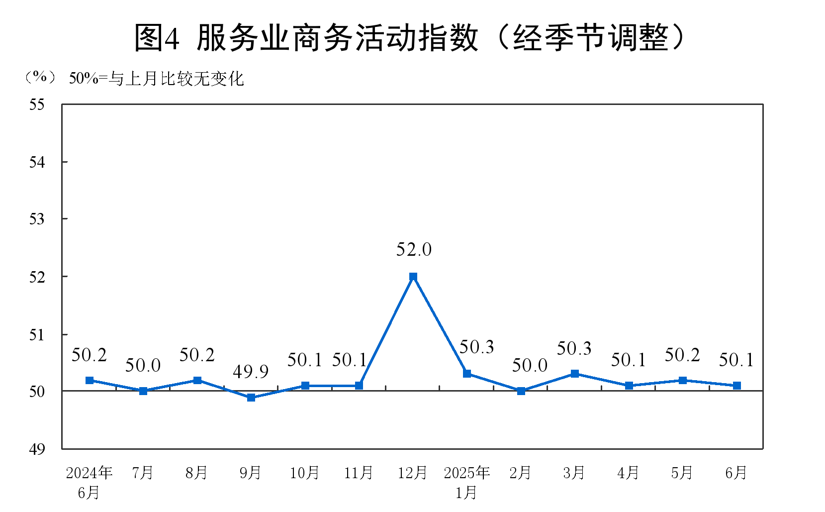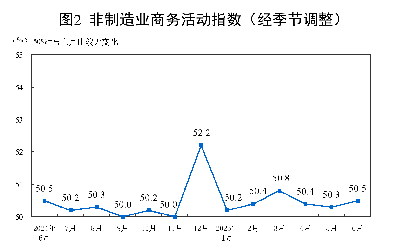 6月份,非制造业商务活动指数为50.5%,比上月上升0.2个百分点,非制造业总体继续保持扩张。