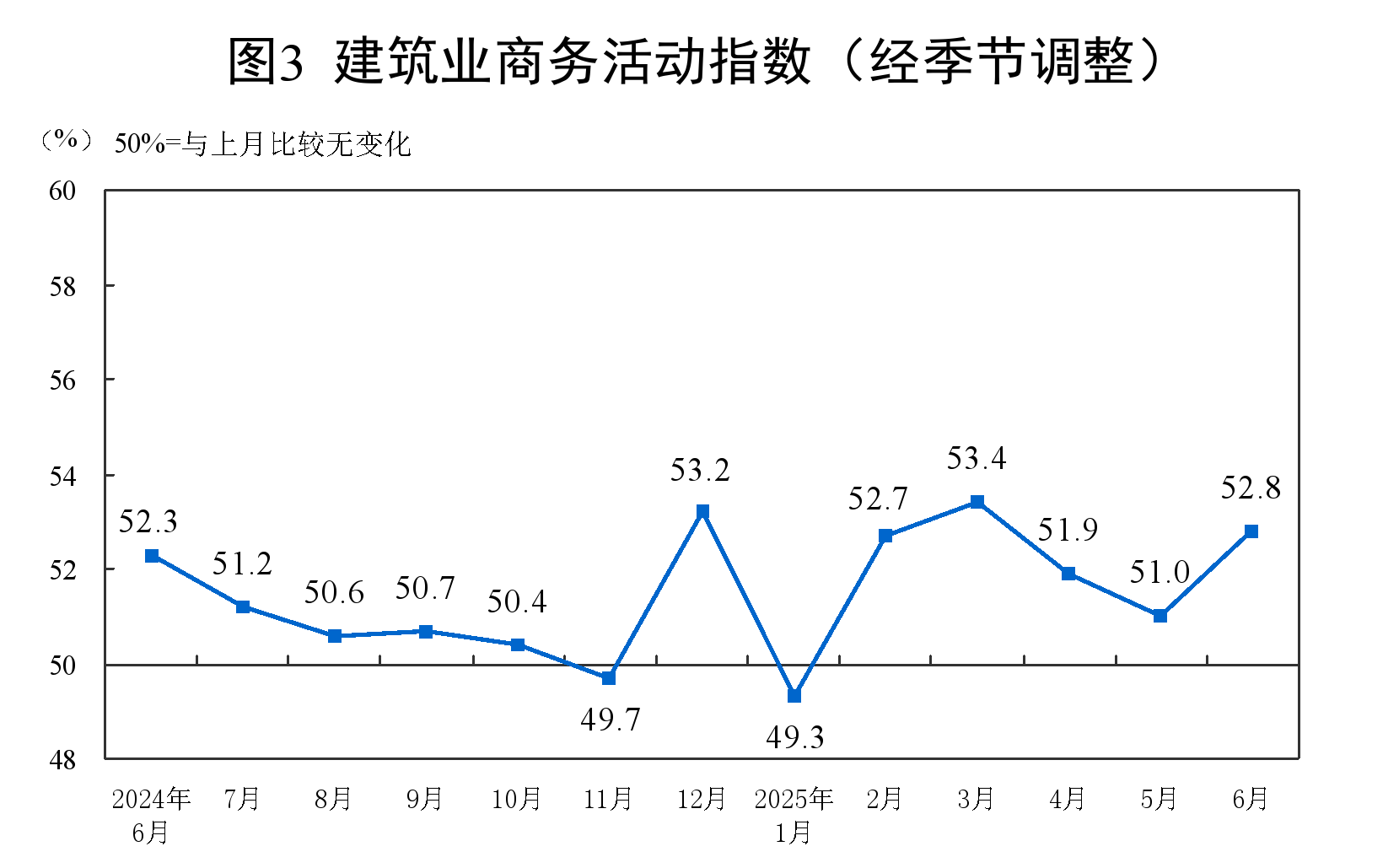 分行业看,建筑业商务活动指数为52.8%,比上月上升1.8个百分点;服务业商务活动指数为50.1%,比上月下降0.1个百分点。从行业看,邮政、电信广播电视及卫星传输服务、互联网软件及信息技术服务、货币金融服务、资本市场服务、保险等行业商务活动指数均位于55.0%以上较高景气区间;零售、道路运输、航空运输、住宿、餐饮、房地产等行业商务活动指数均低于临界点。