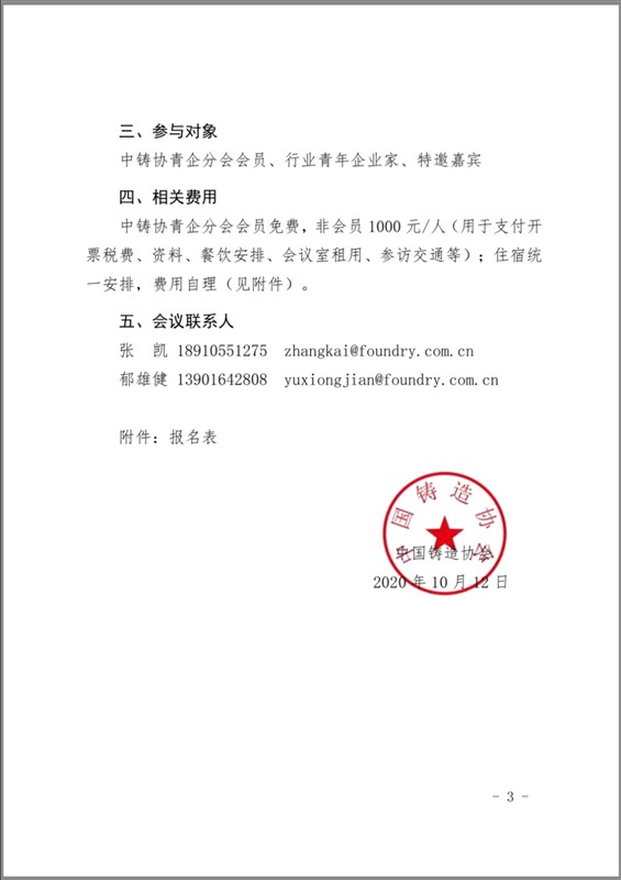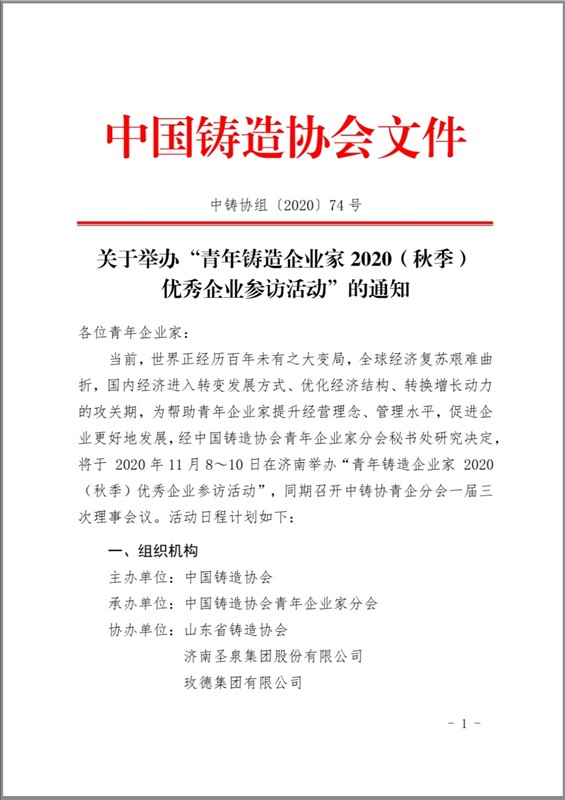 关于举办“青年铸造企业家2020(秋季)优秀企业参访活动”的通知