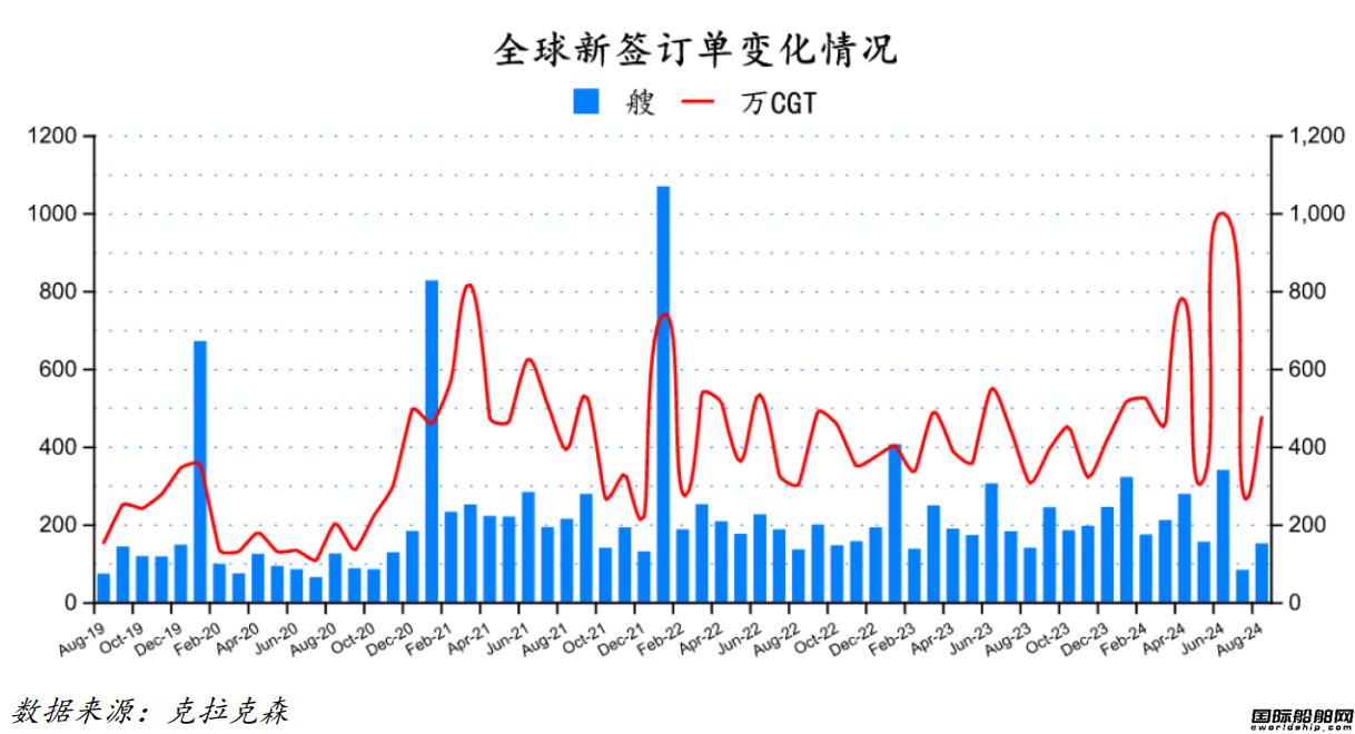 根据克拉克森最新数据统计(截至2024年9月7日),2024年8月份全球新签订单150艘,共计4,770,549CGT。与2024年7月份全球新签订单82艘,共计2,906,420CGT相比较,数量环比增加68艘,修正总吨环比上升64.14%。与2023年8月份全球新签订单139艘,共计3,077,471CGT相比较,数量同比增加11艘,修正总吨同比上升55.02%。