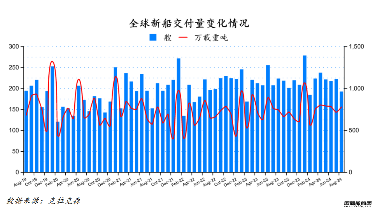 2024年8月份全球船厂共交付新船192艘,共计7,804,189载重吨。与2024年7月份全球新船交付订单222艘,共计7,146,818载重吨相比较,数量环比下跌13.51%,载重吨环比上升9.20%。与2023年8月份全球船厂共交付新船223艘,共计7,452,280载重吨相比较,数量同比下跌13.90%,载重吨同比上升4.72%。