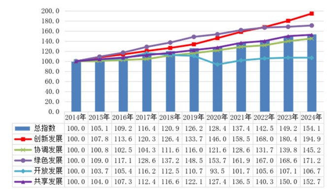 2024年,京津冀三地深入贯彻习近平总书记对京津冀协同发展重要讲话精神,坚持稳中求进工作总基调,扎实推进创新协同与产业协作,不断深化协同发展。测算结果显示,京津冀区域协同发展指数为154.1(以2014年为基期),比2023年提高4.9。其中,创新发展(194.9)和绿色发展(171.2)两个分指数高于总指数,比2023年分别提高14.5和2.6,是主要带动力量;共享发展指数、协调发展指数稳步提升,指数值分别为152.7和145.2,比2023年分别提高2.7和5.4;开放发展有所放缓,指数值为106.7,比2023年下降0.4。