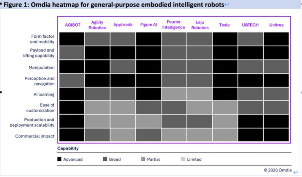 去年,宇树科技的跳舞机器人在春晚期间吸引了全国观众,随即引发了人形机器人开发和投资的爆发式增长。Omdia目前将智元、宇树、特斯拉等企业共同列为全球“第一梯队”人形机器人开发商,这些企业正积极引领行业进步。