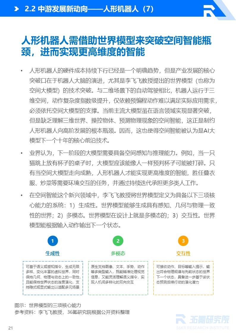作为具身智能的主要载体之一,人形机器人产业将在2026年迈入规模化放量的关键阶段。产品价格持续下探,十万台级别的量产规模可期。与此同时,商业化落地节奏也在日趋加快,工业领域成为商业化扩张的关键一步。除了硬件成本的持续下行,人形机器人发展的核心突破口更在于机器人大脑的演进,特别是李飞飞教授所强调的“世界模型”技术能否取得关键突破。未来,人形机器人需借助世界模型来突破空间智能瓶颈,以实现更高维度的环境理解与自主决策能力。