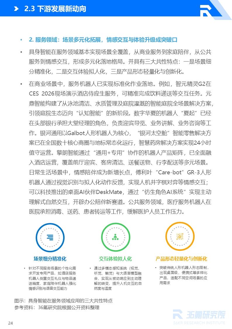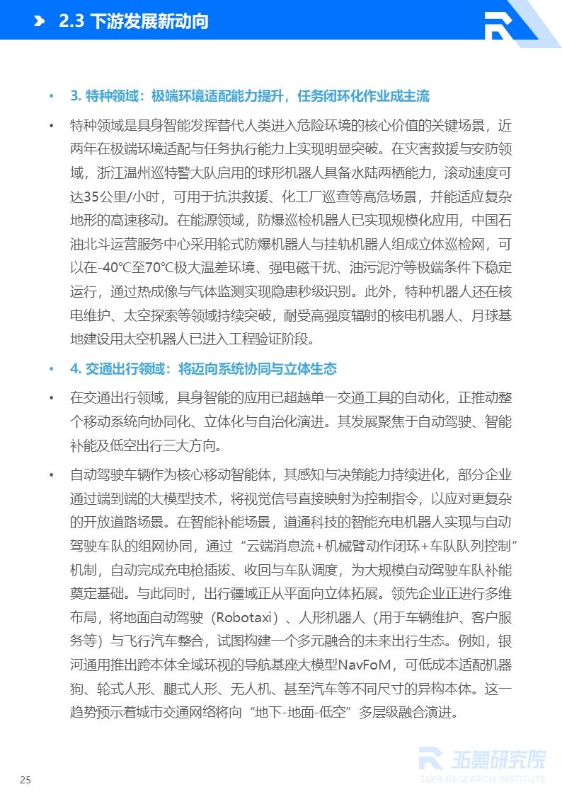 在工业领域,其应用核心已从传统自动化转向支持柔性制造与自主决策,通过融合高精度感知与深度学习技术,有效适应小批量、多品种的复杂任务,并在汽车制造、电子电气等场景加速落地。在服务领域,应用场景覆盖商业、家庭、公共与情感陪伴等,发展呈现场景精准细分、交互体验拟人化以及产品形态轻量化与创新化三大趋势。在特种领域,其应用聚焦于极端环境下的任务闭环作业,适配能力持续增强,已在灾害救援、能源巡检、高危维护等场景实现关键突破。在交通出行领域,发展重心正从单一载具自动化迈向系统级协同与立体化生态构建。