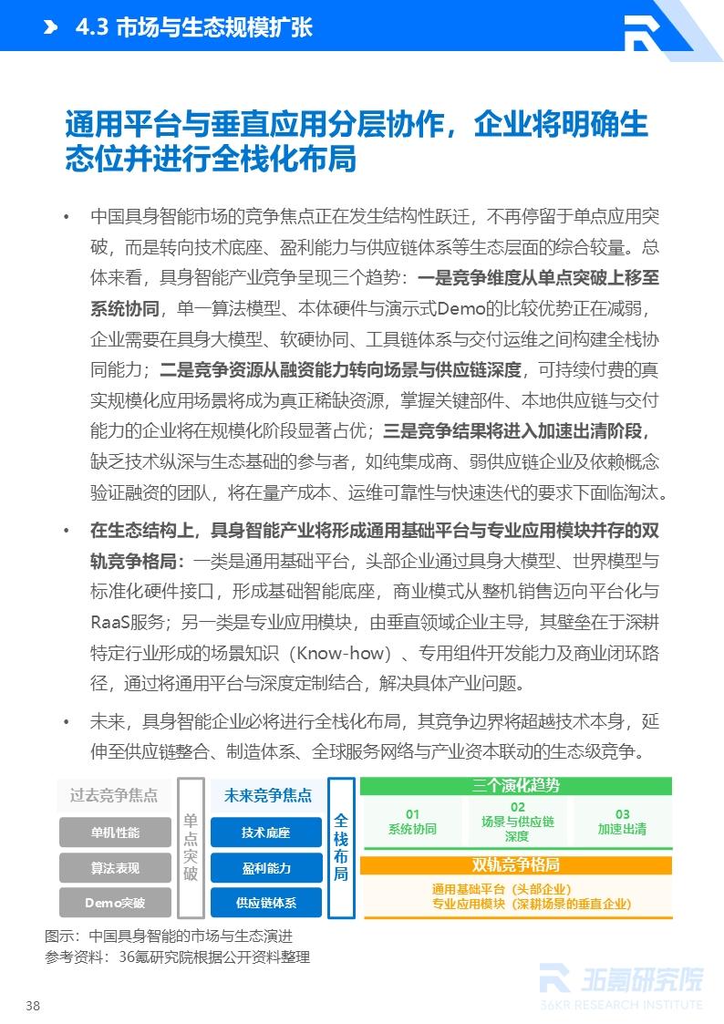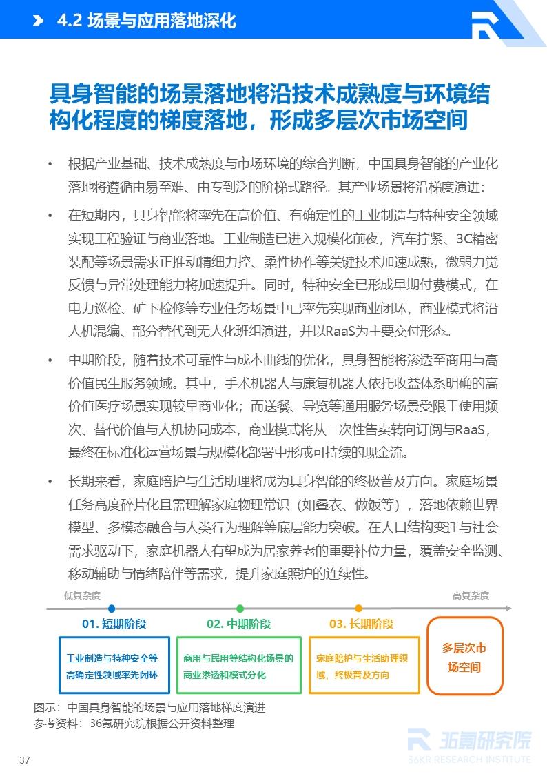 具身智能将在世界模型、数据闭环与协作机制的驱动下转化为可规模部署的通用劳动力,其场景落地将沿技术成熟度与环境复杂度逐级展开,形成多层市场空间。与此同时,中国具身智能市场竞争也将转向技术底座、盈利能力与供应链体系等生态层面的综合较量。