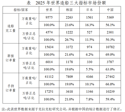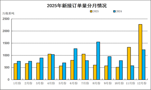 2025年,全国造船完工量5369万载重吨,同比增长11.4%;新接订单量10782万载重吨,同比下降4.6%。12月底,手持订单量27442万载重吨,同比增长31.5%。