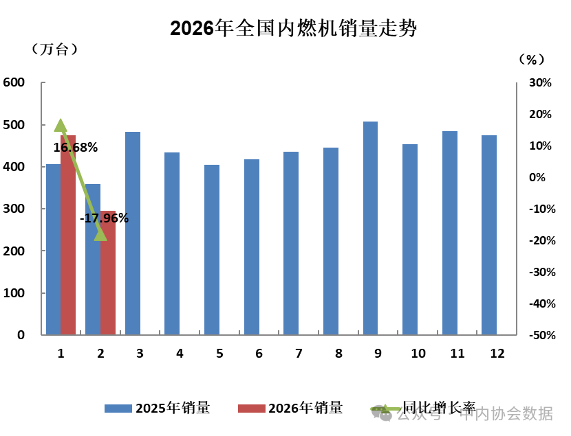 中国内燃机工业协会最新数据显示,2026年2月,我国内燃机销量294.69万台,环比下降37.87%,同比下降17.96%;功率完成16114.17万千瓦,环比下降36.64%,同比下降22.04%。