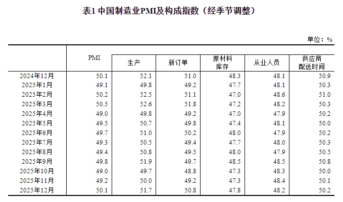 12月份,制造业采购经理指数(PMI)为50.1%,比上月上升0.9个百分点,升至扩张区间。