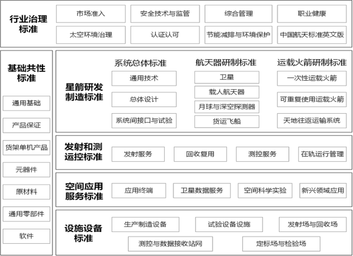 围绕商业航天“箭星场用治”总体布局、全产业链创新、发展模式变革和产业生态打造,遵循“全链条、全领域、模块化、可重构”思路,系统构建覆盖行业治理、研发制造、发射和测运控、空间应用服务、基础共性、设施设备等6个领域的标准体系,体系结构见图1所示,涵盖各级各类适用标准。